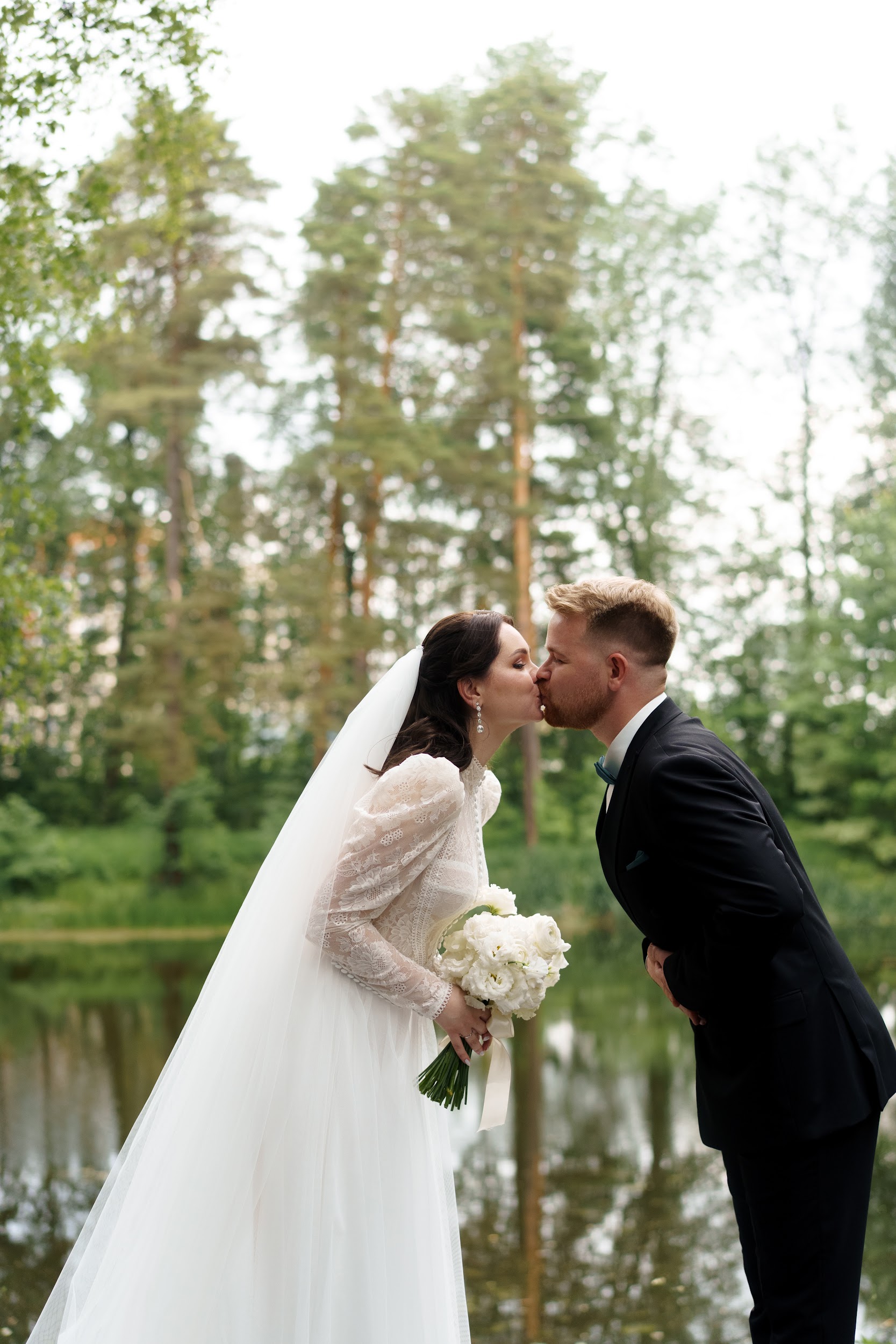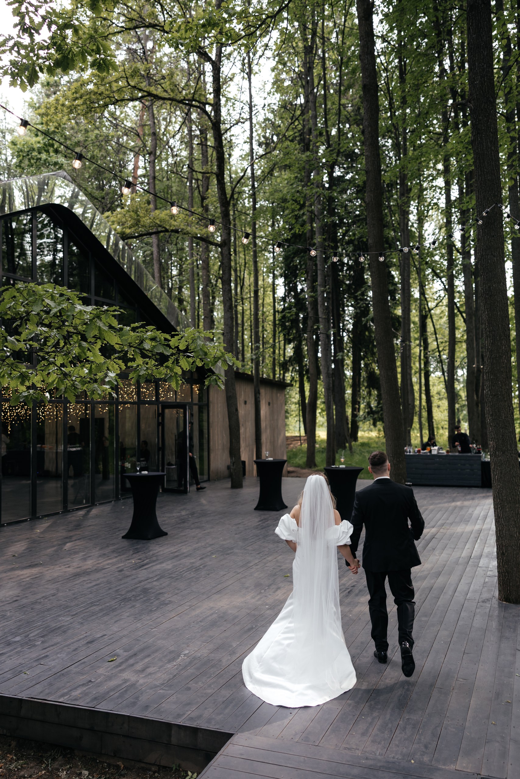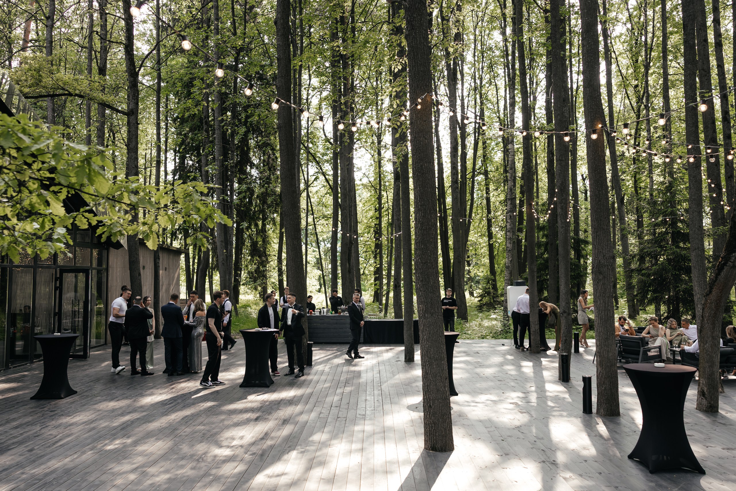 Когда мы впервые приехали на площадку, мы сразу решили, что она станет местом нашей будущей свадьбы. Зеркально гладкое озеро, высокий густой лес — это сказка! На празднике были мы и наши самые близкие дорогие люди, а вокруг — полное уединение! Все окутано свежестью, природой и светом. Очень вкусные блюда и приятный персонал. Ребята, вы лучшие! Спасибо вам за наш день!